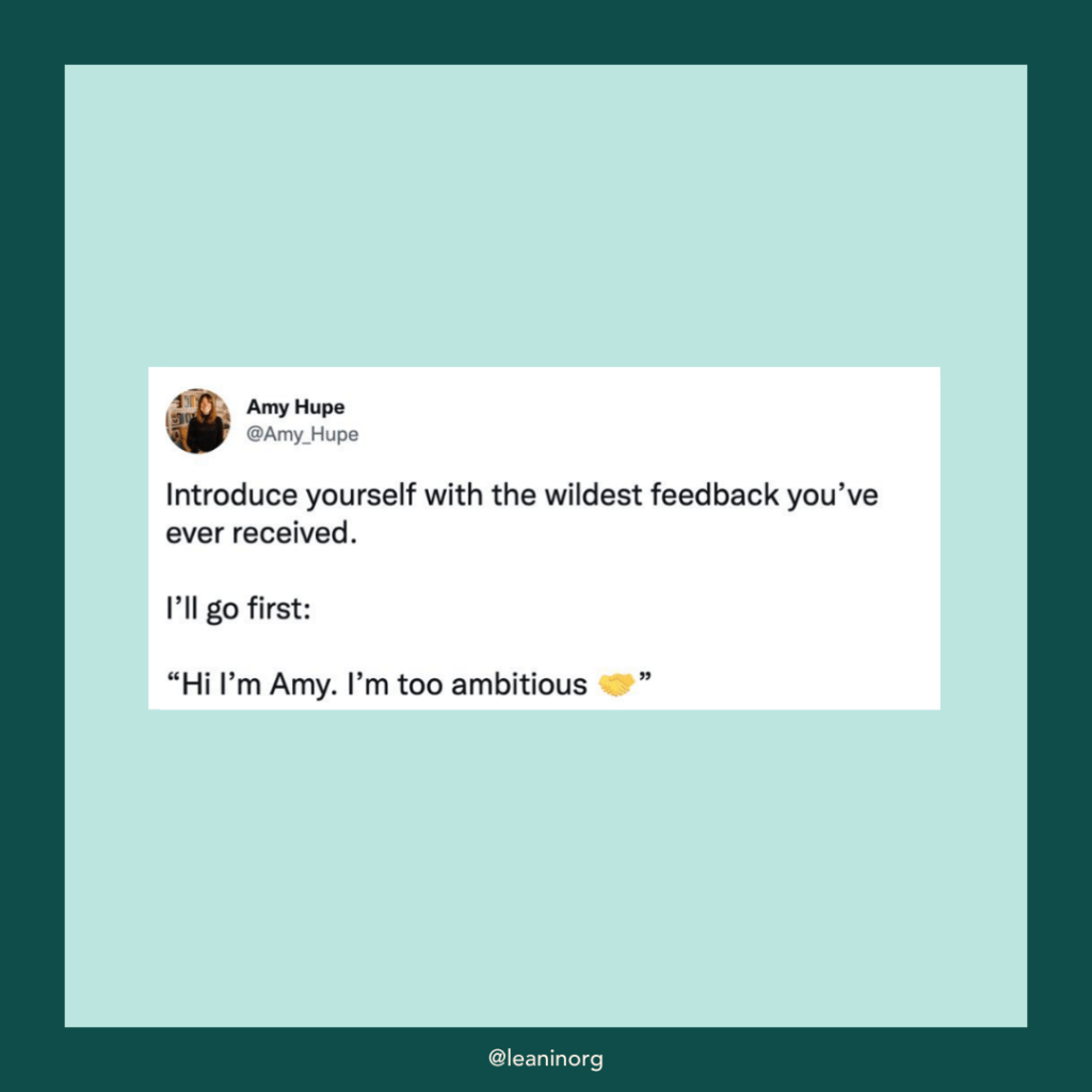 « Présentez-vous avec le retour le plus étrange que vous avez jamais reçu. Je commence : Bonjour, je suis Amy. Je suis trop ambitieuse. »« Pour la plus grande partie de l’histoire, anonyme était une femme. »Virginia Wolf