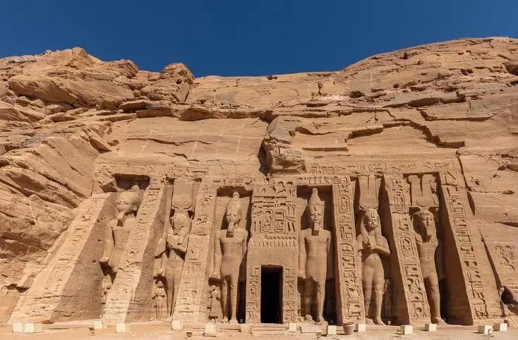 Temple de Néfertari, Abou Simbel, Égypte. (…) De part et d’autre du portail, les statues du roi sont encadrées de statues de la reine. Fait rare dans l’art égyptien, les statues du roi et de sa compagne sont ici de taille égale. Wikimedia Commons [20]